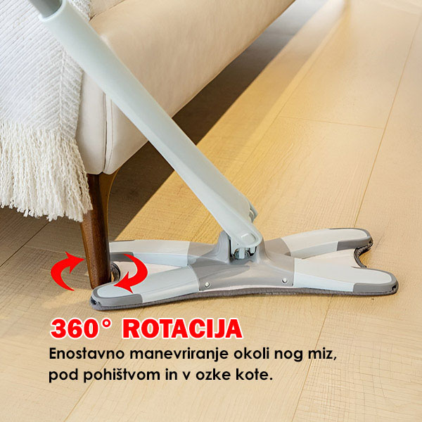 Upogljiva, prilagodljiva glava mopa brez napora doseže ozke prostore—pod pohištvom, za stranišči, okoli nog pohištva in v kote—tako da vam ni treba.