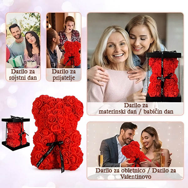 Ta medvedek je posebno, ročno izdelano darilo, ki združuje mehko eleganco vrtnic in čar medvedka. Ko podarite to edinstveno stvaritev, bo zagotovo pustila nepozaben vtis, kar bo izjemno presenečenje.