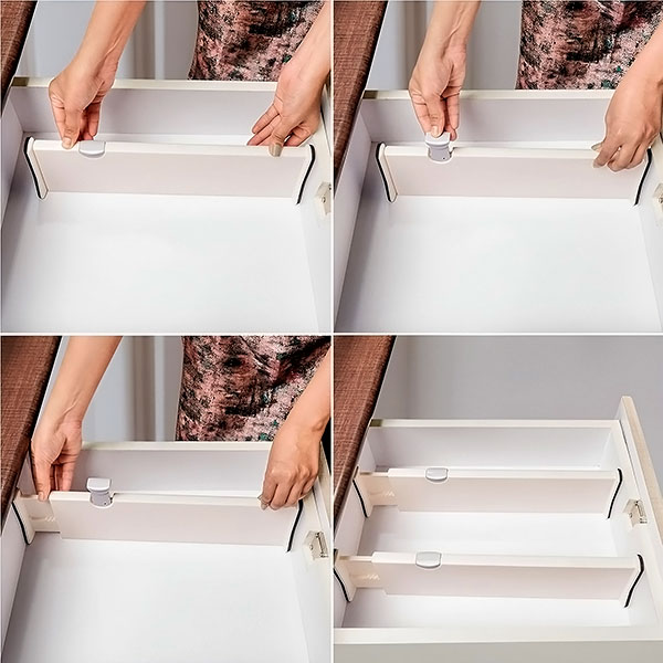 V nekaj sekundah boste preoblikovali svoje neurejene predale. S preprosto namestitvijo “premakni in klikni” organiziranje še nikoli ni bilo tako enostavno. Preprosto postavite, prilagodite in zaklenite delilnik na svoje mesto – brez orodja ali lepila.