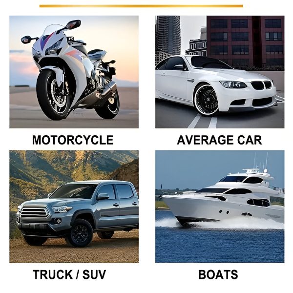 CARCOAT uporabljajte na avtomobilih, čolnih, motornih kolesih, avtodvigalih, štirikolesnikih in drugod. Varen je za vse površine, vključno z barvo, plastiko in steklom.